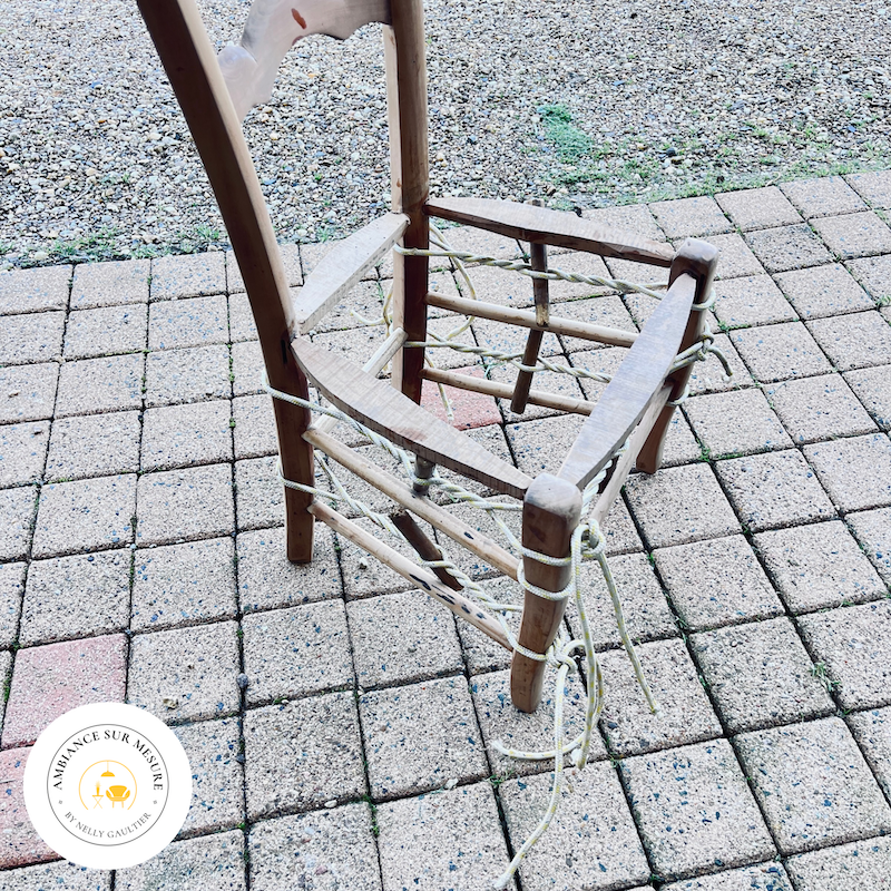 Pour commencer, je démonte la chaise et je recolle de façon traditionnelle les barreaux qui bougent. Je ne peut pas travailler sur un fût, si les barreaux ne sont pas correctement collés. La corde doit rester parfaitement en place pendant la durée du tressage, si le barreau bouge la corde glisse et le travail n’est pas de bonne qualité.